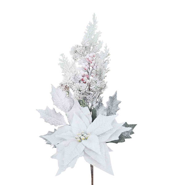 Ветка с пуансеттией серебряного цвета в инеевом покрытии — это эффектное декоративное украшение в винтажном стиле, выполненное из пластика. Высота ветки составляет 70 см, что позволяет использовать её для оформления праздничных композиций, венков, букетов или интерьера в зимнем стиле.