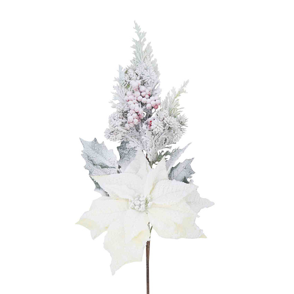 Ветка декоративная Пуансеттия с зелеными хвойными веточками и красной рябиной желтый с эффектом инея 70см