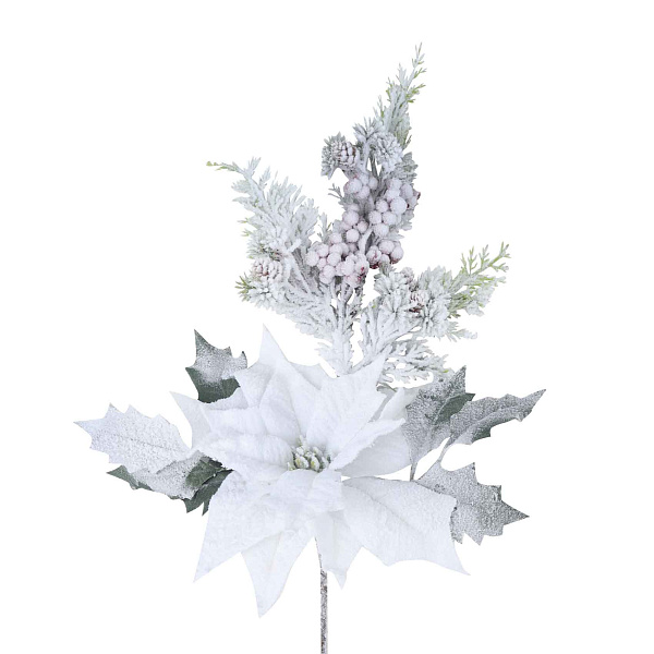 Ветка декоративная Пуансеттия в нежном инеевом покрытии белая 70см