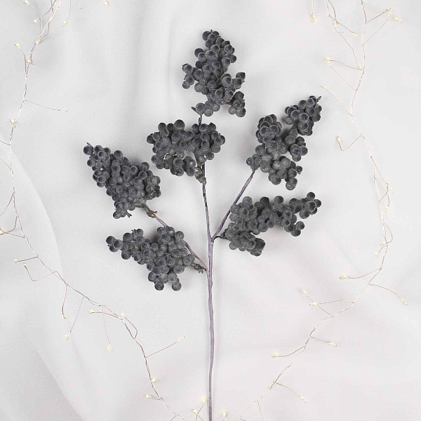 Новогодняя ветка «Ягоды» выполнена из пластика и текстиля серого цвета. Эффект инея придает ей зимнее настроение и создает атмосферу праздника. Веточка длиной 35 см подходит для украшения интерьера, новогодних композиций и букетов. Ветка состоит из нескольких мелких веточек с ягодами с пушистым покрытием. Материал не теряет форму со временем.