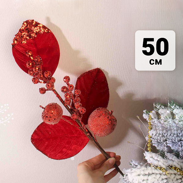 Декоративная фруктовая ветка в винтажном стиле выполнена из полимерных материалов с покрытием из мягкого велюра насыщенного красного цвета. Ветвь украшена бархатистыми листьями и элементами в виде мелких и крупных ягод с блестящим напылением, что придает изделию изящность и праздничность. Общая высота ветки составляет 50 см, что делает ее удобной для использования в различных флористических композициях и декоре интерьера.