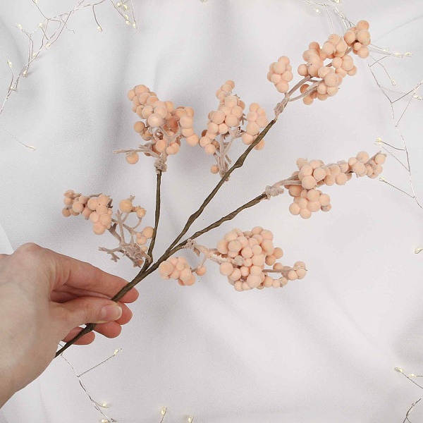 Новогодняя ветка «Пушистые ягоды» выполнена в нежно-розовом цвете. Длина ветки – 35 см. Ягоды покрыты мягким текстильным материалом, который придает им необычную пушистую фактуру. Стебель изготовлен из пластика и текстиля, что делает ветку легкой и удобной для декорирования.