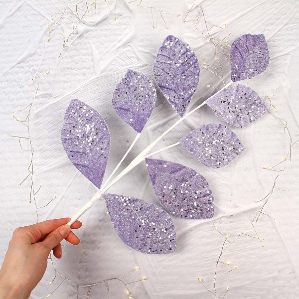 Ветка с листьями декоративная с серебристыми пайетками сиреневый 50см