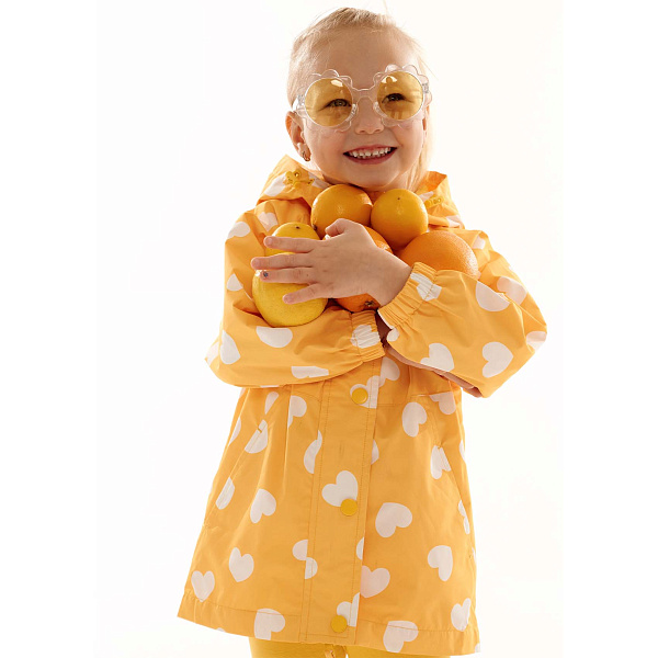 Ветровка для девочки идеально подходит в весенне-осенний период, когда температура воздуха опускается не ниже 8 градусов. Модель выполнена в ярко желтом цвете. Яркие принты в виде сердечек поднимут малышке настроение, напомнят о радостных минутах, полученных от прогулок на свежем воздухе.