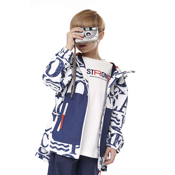 Ветровка Lanson Kids с капюшоном и крупными надписями бело-синяя