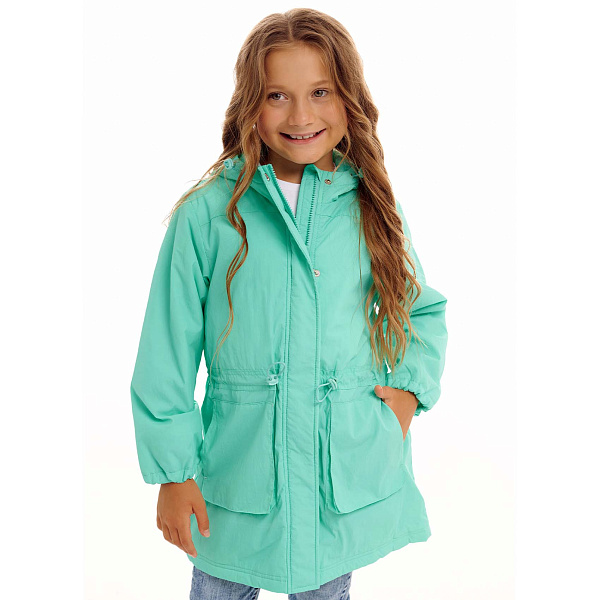 Удлиненная ветровка предназначена для девочек. Модель с глубоким капюшоном имеет утягивающий шнурок на талии, застежку в виде молнии и накладные карманы. Оригинальный крой позволяет приобрести изделие с небольшим запасом. Манжеты с резинками на рукавах надежно защищают ребенка от холодного ветра.