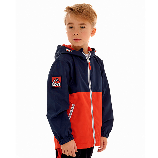 Яркий дизайн сочетает ткань контрастных оттенков. Детали на карманах и нашивки на рукаве и спине понравятся маленькому моднику. Капюшон защитит от неожиданного дождя. Резинки-утяжки с фиксаторами делают ветровку непродуваемой.