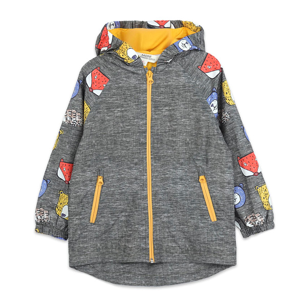 Детская ветровка выполнена в темно-сером цвете с меланжевым эффектом, дополнена оригинальным принтом в виде разноцветных звериных мордочек. Это смотрится игриво и привлекательно. Капюшон в аналогичном дизайне защитит от холодного ветра.