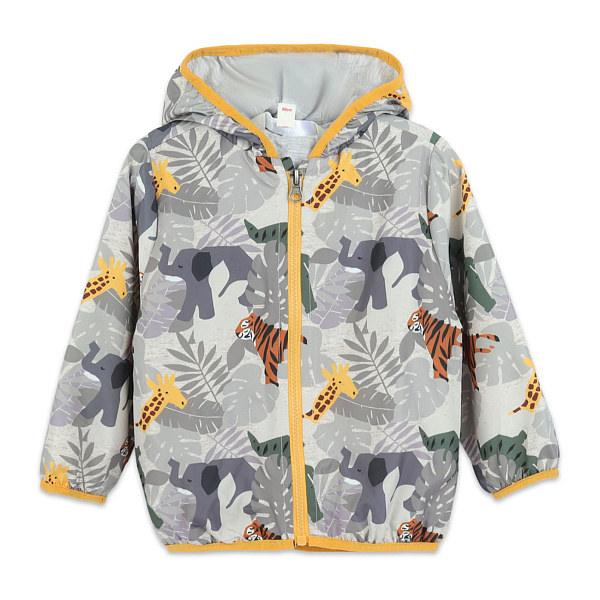 Детская ветровка оформлена в серо-желтой цветовой гамме с принтом слонов, зебр и тигров на фоне тропических листьев. Модель снабжена капюшоном с декоративными деталями в виде животных ушек, выделенных желтым цветом. Ветровка застегивается на заметную желтую молнию, которая контрастирует с основным цветом и облегчает процесс одевания. Края рукавов и низ изделия окантованы желтым цветом, подчеркивая стильный дизайн. Материал верха изделия составляет 100% полиэстер, а подкладка выполнена из 100% хлопка, гарантируя комфорт и уют при носке.