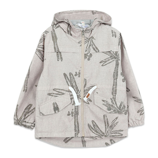 Детская ветровка представлена в бежевом цвете с принтом в виде темно-серых листьев бамбука. Изделие имеет капюшон, застежку-молнию спереди и два боковых кармана на клапанах. Ветровка изготовлена из полиэстера, что гарантирует износостойкость и легкость в уходе, а подкладка выполнена из хлопка, предоставляя дополнительный комфорт при носке.