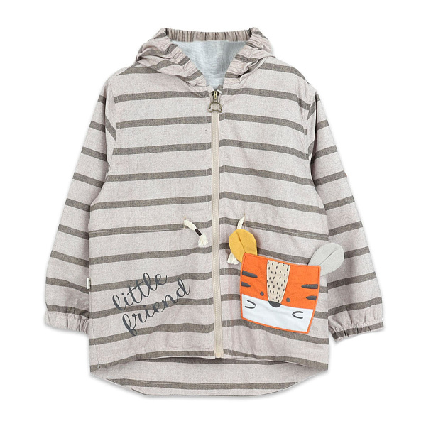 Детская ветровка выполнена в полосатом дизайне, сочетающем серый и бежевый цвета. Модель оснащена капюшоном с имитацией ушек, что придает изделию веселый и игривый вид. На передней части расположен карман с аппликацией в виде мордочки тигренка и надписью. Ветровка застегивается на молнию, удобную для самостоятельного использования ребенком. Верх изделия состоит из полиэстера, а подкладка изготовлена из 100% хлопка, что гарантирует комфорт и долговечность при носке.