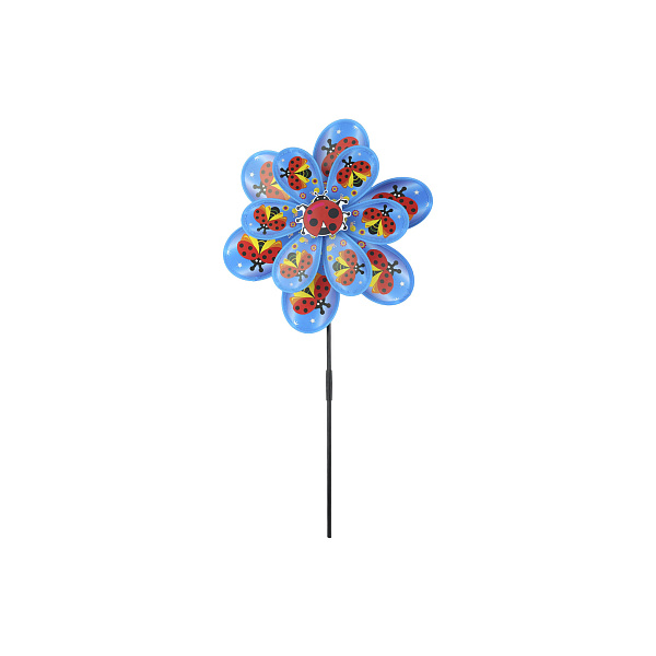 Ветрячок в форме цветка с изображением божьих коровок на лепестках – это веселый садовый аксессуар высотой 40 см. Лепестки выполнены в синих тонах с милыми красными божьими коровками, что придает изделию живописный и игривый вид. Контрастные желтые цветочки и звездочки на фоне синего создают ощущение летнего сада. Центральная часть ветрячка, имитирующая сердцевину цветка, выполнена в виде объемной божьей коровки.