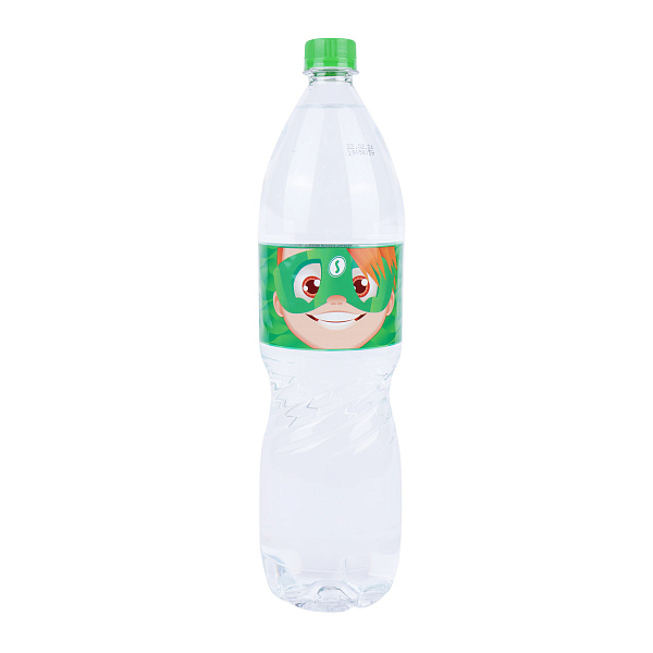 Бутылка объемом 1,5 литра изготовлена из безопасных материалов и имеет удобную форму, которая легко помещается в руку, что облегчает использование. На этикетке изображен дружелюбный персонаж, что привлекает внимание детей.