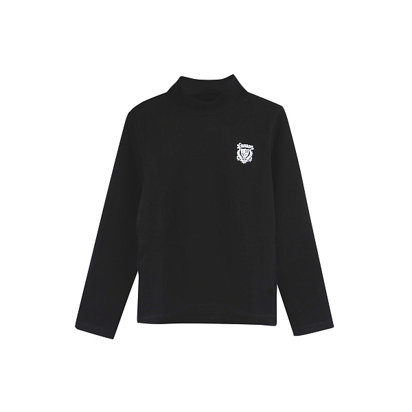 Однотонную черную расцветку разнообразит геральдический принт на груди. Водолазка этой модели органично сочетается с любой одеждой темных тонов, она пригодна как дополнение к школьной форме, а также хорошо смотрится в прогулочном или спортивном комплекте.