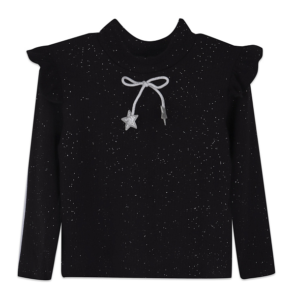 Выполнена из мягкого материала, состоящего на 50% из вискозы, на 45% из полиэстера и на 5% из эластана, что обеспечивает изделию комфортную посадку и долговечность. Водолазка украшена блестящими вставками, придающими ей особый шарм и привлекающими внимание. На воротнике стильная декоративная завязка с подвесками в виде звездочек, придает водолазке оригинальность и делает образ девочки завершенным.