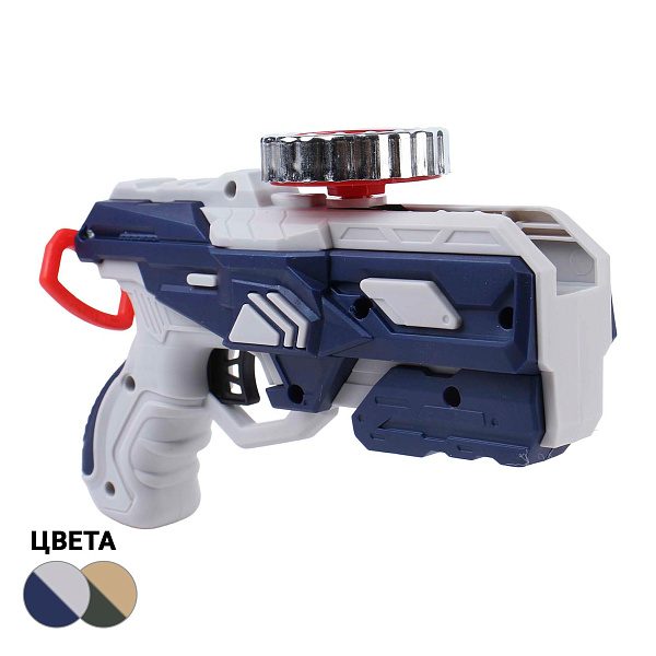 Корпус пистолета выполнен из прочного пластика, который выдерживает активные игры. Удобная рукоять способствует комфортному захвату, обеспечивая надежность в использовании. Наверху пистолета расположен волчок, который приводится в движение простым нажатием на курок. Это добавляет элемент неожиданности и азарта в каждом запуске.