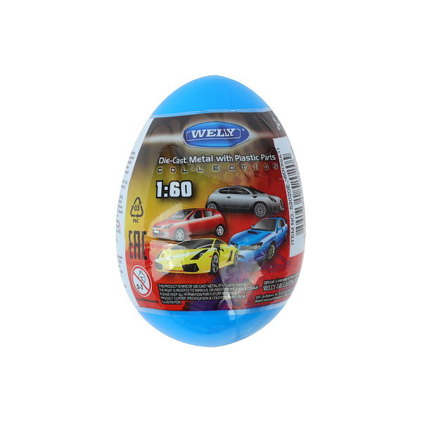 Яйцо-сюрприз – это оригинальная игрушка с подарком в виде маленькой машиной внутри. В коллекции четыре варианта игрушек: кабриолет, внедорожник и две гоночных машинки. Узнать, какая досталась вам, можно, только открыв яйцо. Модели изготовлены в размере 1:64. Корпус выполнен из металла. Небольшие колеса легко крутятся. Есть дополнительные пластиковые декоративные элементы.