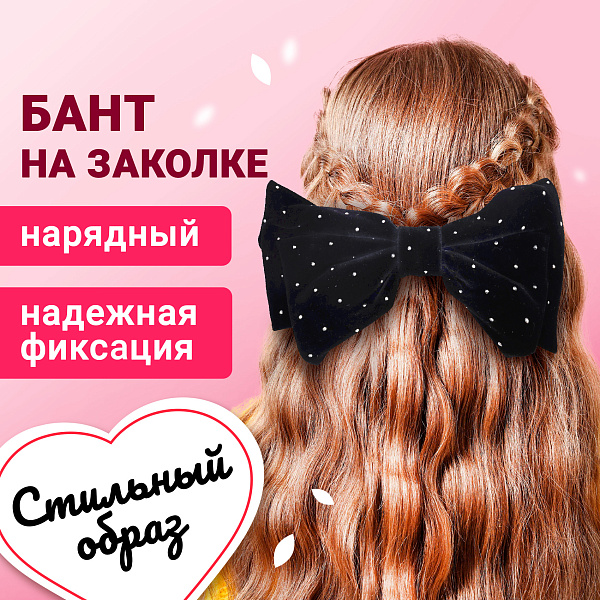 Черная заколка-автомат — идеальный выбор для маленьких девочек дошкольного возраста. Представляет собой аксессуар в виде бархатного черного бантика, украшенного блестящими камушками. Заколка превосходно удерживает детские волосы, придавая образу нотки элегантности. Материал изделия — металлический зажим и текстильный бант — гарантируют его долговечность и безопасность для детского здоровья.