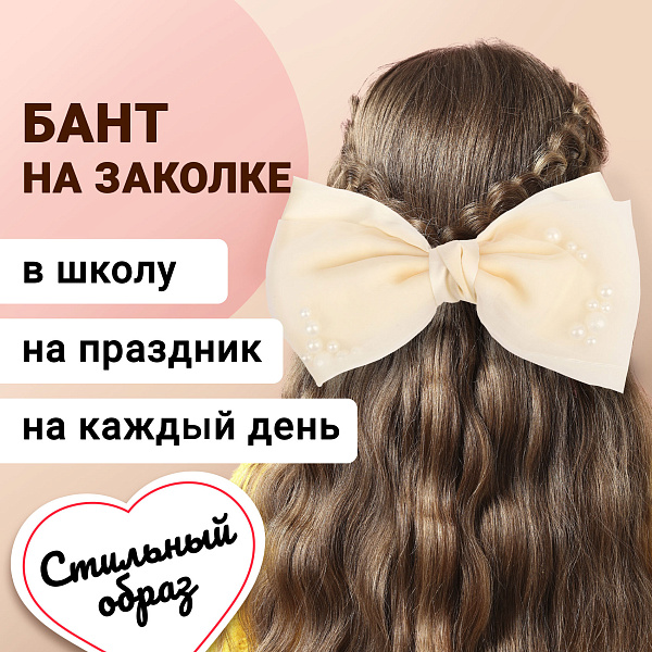 Изысканный бант молочного цвета, декорированный маленькими бусинами, станет радостным дополнением к образу вашей дочери.