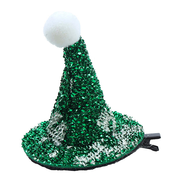 Заколка новогодняя Шляпка блестящая с белым помпоном зеленая
