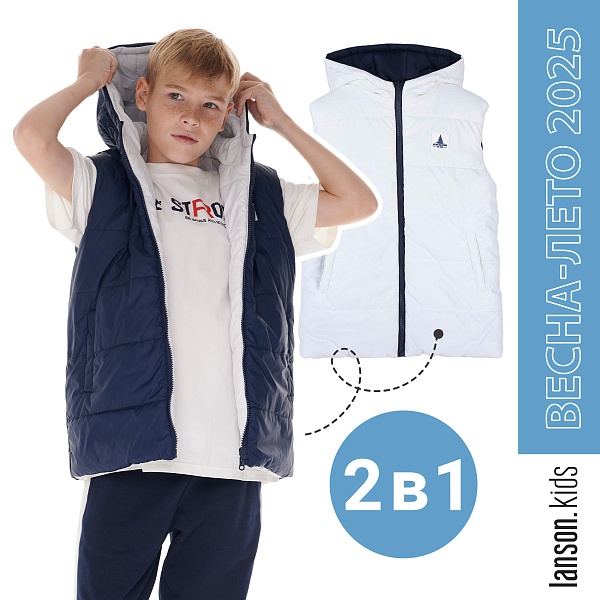 Утепленный двусторонний жилет для мальчика выполнен из прочного полиэстера, который хорошо сохраняет тепло, отталкивает влагу и защищает от ветра. Внешняя поверхность белого цвета, создающая легкость и свежесть образа, а обратная сторона — глубокого синего оттенка, который добавит яркости и уверенности.