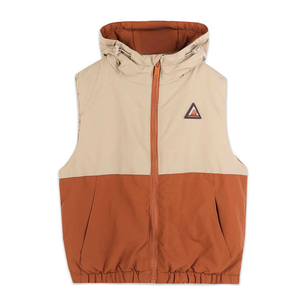 Застегивается жилет молнией под горло, а объемный капюшон защитит от непогоды голову, горло, шею. В цветовом оформлении сочетаются коричневый и бежевый цвета. Главные достоинства этой модели – красота и практичность.
