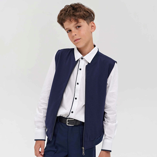 Классический школьный жилет для мальчика станет отличным дополнением к повседневному гардеробу. Он имеет удобную застежку на молнию и карманы для мелочей. Жилет выполнен в универсальном синем цвете. Материалы верха включают 66% вискозы, 29% нейлона и 5% эластана. Подкладка из 100% полиэстера добавляет износостойкость. Жилет не только дополнит образ, но и согреет в холодное время.