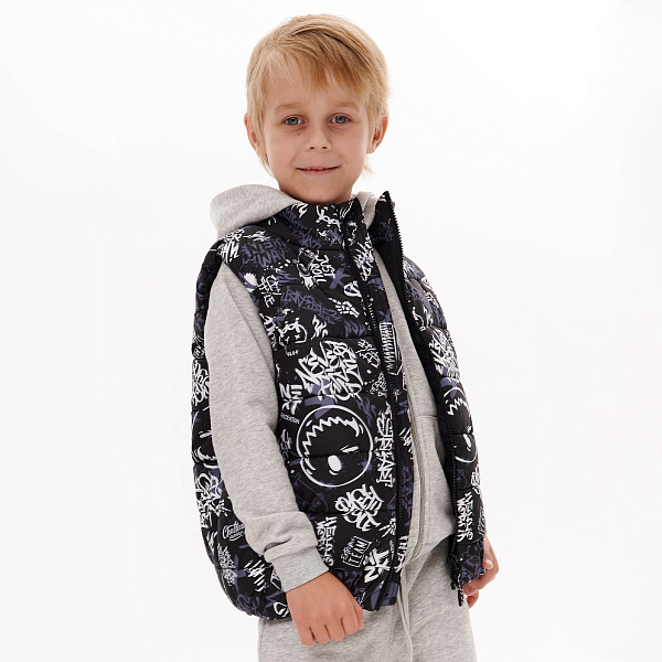 Утепленный жилет для мальчика станет незаменимой вещью для прогулок в межсезонье. Жилет выполнен из качественного полиэстера, который отталкивает влагу и устойчив к холоду и ветру. Основной цвет – черный, с ярким и стильным принтом. Молния спереди обеспечивает легкость и удобство надевания.