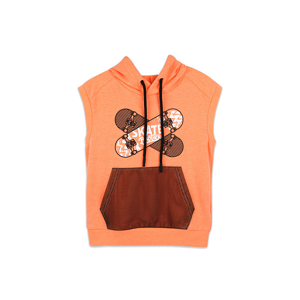 Основной цвет изделия – оранжевый. На груди имеется принт в виде двух скрещенных скейтов, на животе – сетчатая вставка.
