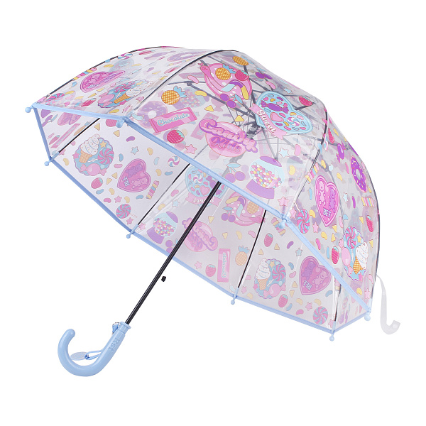 Прозрачный зонтик с принтом в виде сладостей станет ярким аксессуаром для любого ребенка. Розовые и голубые тона создают веселое настроение, а изображения конфет и пирожных делают каждую прогулку под дождем увлекательным приключением. Купол зонта изготовлен из прочного POE, что делает его надежным в использовании при непогоде. Удобная ручка подходит для маленьких рук, позволяя ребенку с легкостью держать зонтик самостоятельно. Эта модель идеально подходит для повседневного использования, защищая от дождя и добавляя элемент игры в пасмурные дни.