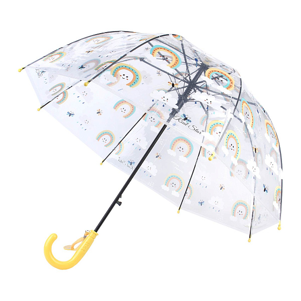 Детский зонтик выделяется ярким и добрым дизайном с радугами и облачками. Прозрачный купол украшен красочными мотивами, которые изображают радужное небо с улыбающимися облаками и веселыми каплями дождя. Такой дизайн поднимает настроение и добавляет радость в любой пасмурный день.