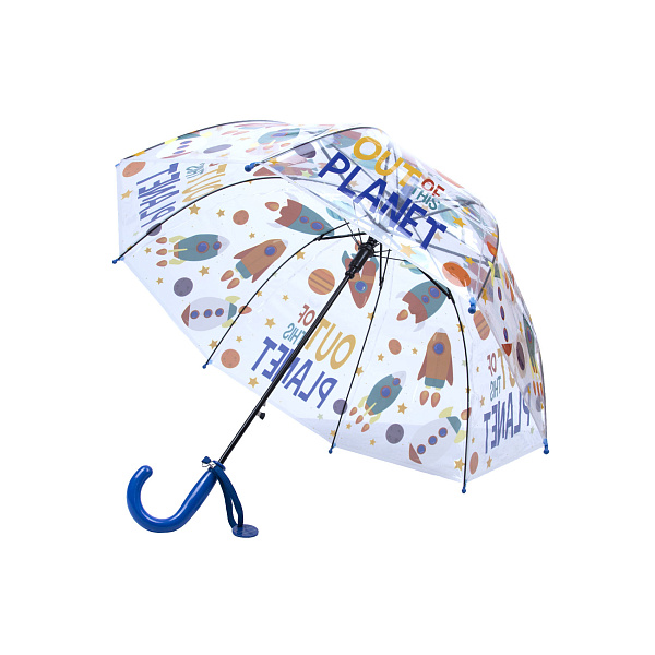 Прозрачный купол этого зонта сразу бросается в глаза — на нем нарисованы космические ракеты взлетающие в воду. Прочный и безопасный материал не промокает, не теряет яркость, а изображения остаются четкими и насыщенными даже после долгой эксплуатации. Благодаря специальной форме «колокольчик» капли стекают на асфальт, не попадая на ребенка. Также все спицы на концах защищены резиновыми наконечниками для безопасности окружающих детей, ведь неосторожное раскрытие может привести к травме. К пластмассовой рукояти привязан брелок с двумя полями — если туда вписать имя и фамилию, группу в детском саду или класс, то в случаен потери, он обязательно найдет своего хозяина. Рекомендовано для детей дошкольного и младшего школьного возраста.