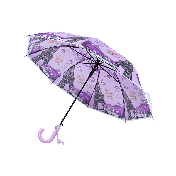 Оригинальный зонтик станет предметом обожания для ребенка 4-5 лет. У модели по ткани бледно-розового оттенка расположены по кругу серые фигуры Эйфелевой башни и лимузина глубоко-розового цвета. Имеется и ряд мелких деталей в виде деревьев и др.