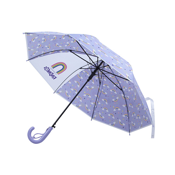Симпатичный зонтик станет приятным подарком для ребенка 4-5 лет. Основу рисунка по ткани фиолетового оттенка составляют мелкие загадочные фигурки в виде радуги. Один из секторов модели украшен крупным изображением радуги и надписью «Kindness» – Доброта. Небольшие радужные изображения расположены по всей площади изделия.